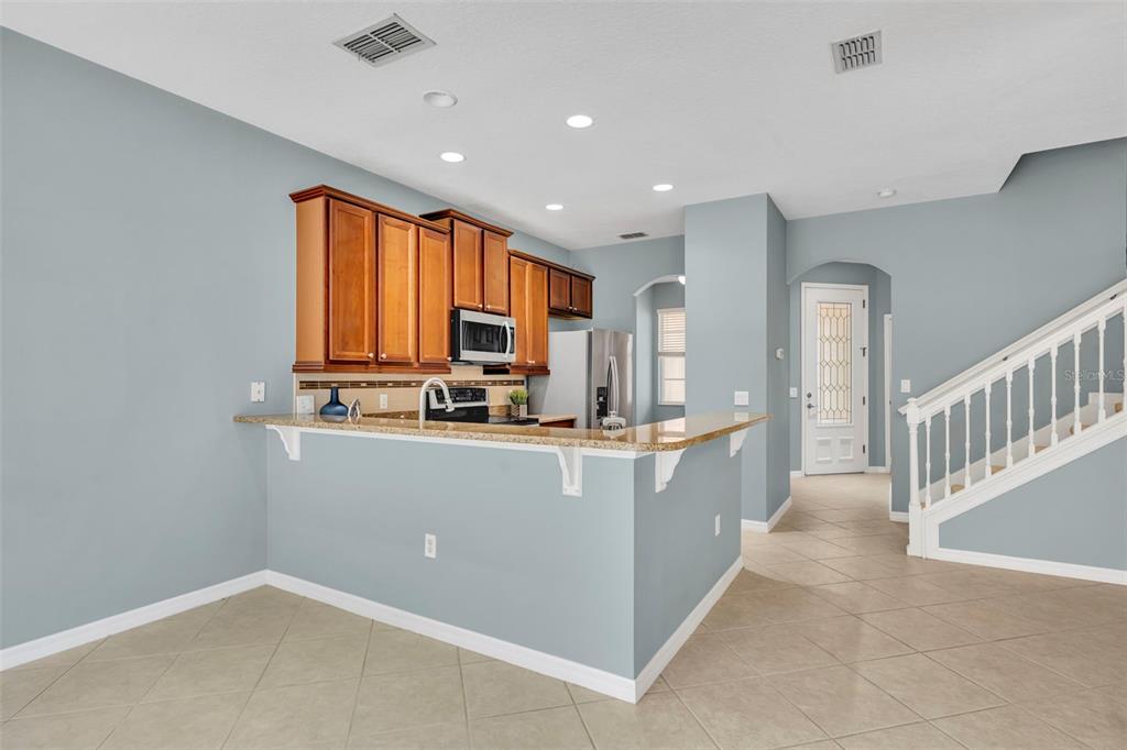One or more photo(s) has been virtually staged. Welcome to Grandview Isles, a charming and private community nestled in the heart of it all—one of Central Florida’s most desirable areas, renowned for its top-rated schools and picturesque surroundings. This beautifully designed two-story townhome offers a perfect blend of comfort, style, and convenience. Step inside to discover a bright, open-concept living area that flows effortlessly into a modern kitchen. The kitchen features sleek granite countertops, a spacious breakfast bar, and plenty of room for both casual dining and entertaining guests. Upstairs, you’ll find three well-appointed bedrooms and a conveniently located laundry room, making day-to-day living more efficient. The spacious primary suite is a peaceful retreat, highlighted by a generous walk-in closet, and a spa-like en-suite bathroom. You'll love the double vanity with granite countertops, a relaxing garden tub, and a separate shower equipped with dual shower heads. Outside, the home's attractive exterior complements the overall aesthetic of the Grandview Isles community. Step through the sliding doors to your private back screened patio—perfect for unwinding and taking in peaceful lake views. In the evenings, enjoy a touch of magic as you watch the Walt Disney World fireworks light up the sky from the comfort of your own backyard personal space. Enjoy the ease of an attached one-car garage along with additional guest parking. For those who love the outdoors, the community offers a lakefront dock—ideal for fishing, kayaking, or simply soaking in the Florida sunshine. This home’s prime location provides quick access to major highways, making commuting simple and stress-free. You’ll also be just minutes from local shopping, dining, grocery stores, and entertainment. Popular destinations such as Orlando's premier theme parks, International Drive, and Grand Cypress Golf Club are just a short drive away. NEW AC 2024! Don’t miss the opportunity to make this exceptional townhome your own. Schedule your private tour today and see why so many are proud to call Grandview Isles home!