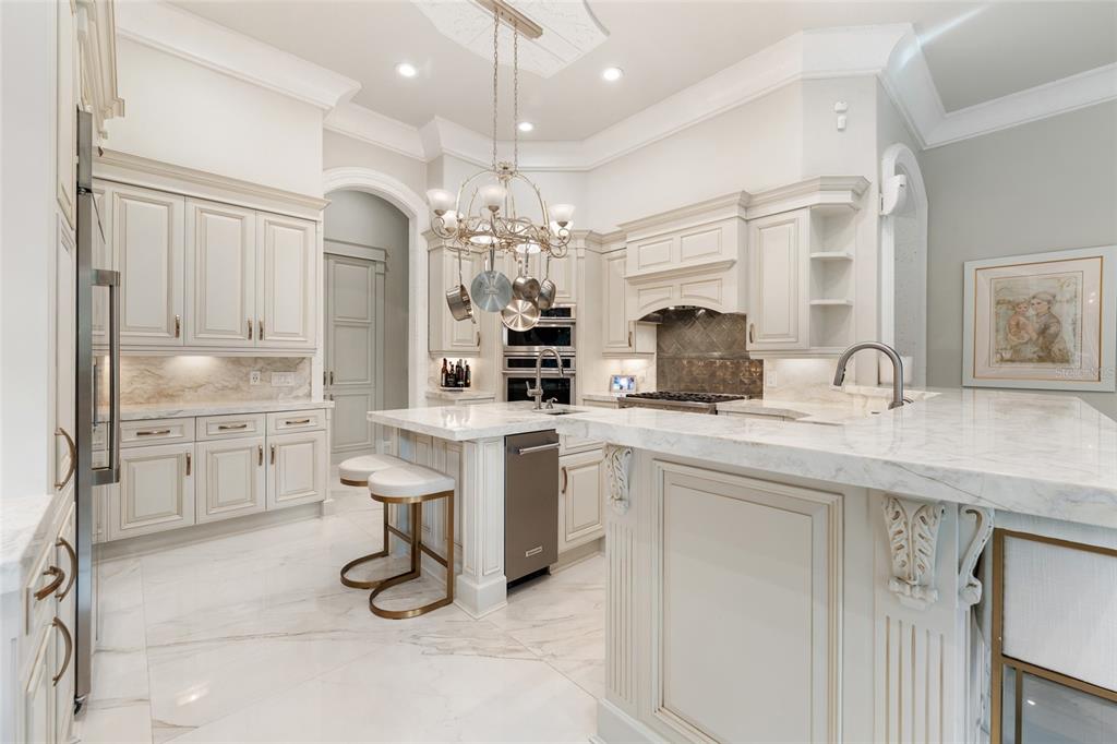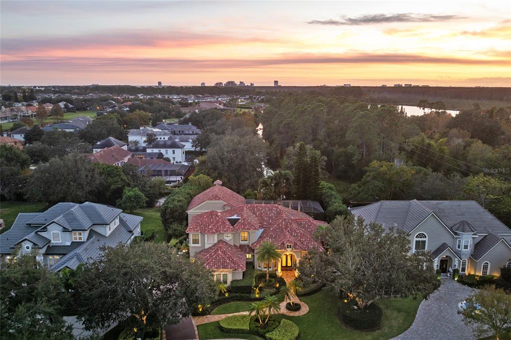 This newly renovated waterfront five-bedroom, 4.5-bath estate is the ultimate staycation residence, designed and built by a local resort developer who spared no expense in creating a luxury living experience. In one of Central Florida’s exclusive 24-hour guard-gated communities, the home offers an exceptional blend of luxury, privacy, security and recreation. Uniquely positioned on a quiet, pristine canal with direct access to the renowned Butler Chain of Lakes, this residence delivers an unparalleled waterfront lifestyle on one of the desirable lake systems in the state. The open-concept interior showcases expansive living spaces, soaring ceilings, and stunning water views throughout. A rare indoor half-court basketball and sports court features 25-foot vaulted ceilings, a regulation basketball hoop, stone fireplace, and a wall of glass French doors overlooking the pool, lanai and canal. This versatile space also serves as a spectacular entertaining area and could be reconfigured into a private guest or in-law suite with separate street access. The space includes a large-screen TV and high-definition projector for nighttime entertainment. Additional amenities include a first-floor 4K movie theater with 115-inch screen and surround sound, a 600-bottle temperature-controlled wine cellar with VintageView display, and a gourmet chef’s kitchen featuring all-new GE Monogram appliances, custom cabinetry, premium stone countertops, instant hot water and a silent remote blower hood system. A dual-use butler’s pantry and laundry room offers an extra dishwasher, sink, under-counter beverage and wine refrigerators, and generous counter space for small appliances. The primary suite is a private retreat featuring a spa-inspired bath with two-person soaking tub, fireplace, built-in TV, steam shower, instant gas water heater and automated blackout shades. Toto heated washlet systems are installed in all full baths. Outdoor living rivals a luxury resort with a 40-foot swimming pool and spa with gas and electric heat, custom pool finish, travertine decking, new screen enclosure and dramatic nighttime lighting. The covered lanai includes a summer kitchen, entertainment bar, gas fireplace, gas fire pit, 240-volt ceiling heater for year-round comfort, stone fountain wall and seamless connection to the indoor sports court. A private boat dock has been fully renovated with composite decking, new lift motor and cradle, automated boat cover, two covered jet ski lifts and paddleboard launch. Extensive upgrades include new impact windows, high-SEER HVAC systems, custom porcelain tile, custom cabinetry and stone counters throughout, custom iron front door, custom chandeliers, precast baseboards and crown molding, automated Control4 home automation with Alexa integration, landscape lighting throughout front yard, backyard and dock, new insulated garage doors with cameras, built-in garage cabinetry, maintenance-free garage flooring, 15KV generator, lightning protection system, concrete safe room with steel door, private monitoring security system and 16 exterior cameras. On a private cul-de-sac with no homes in front or behind, the property also offers access to community amenities, including tennis, pickleball, basketball courts, park, playground, fishing pond and 24/7 staffed gate.
