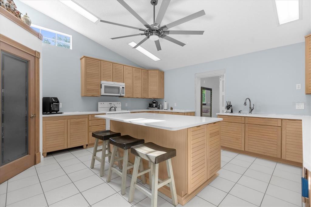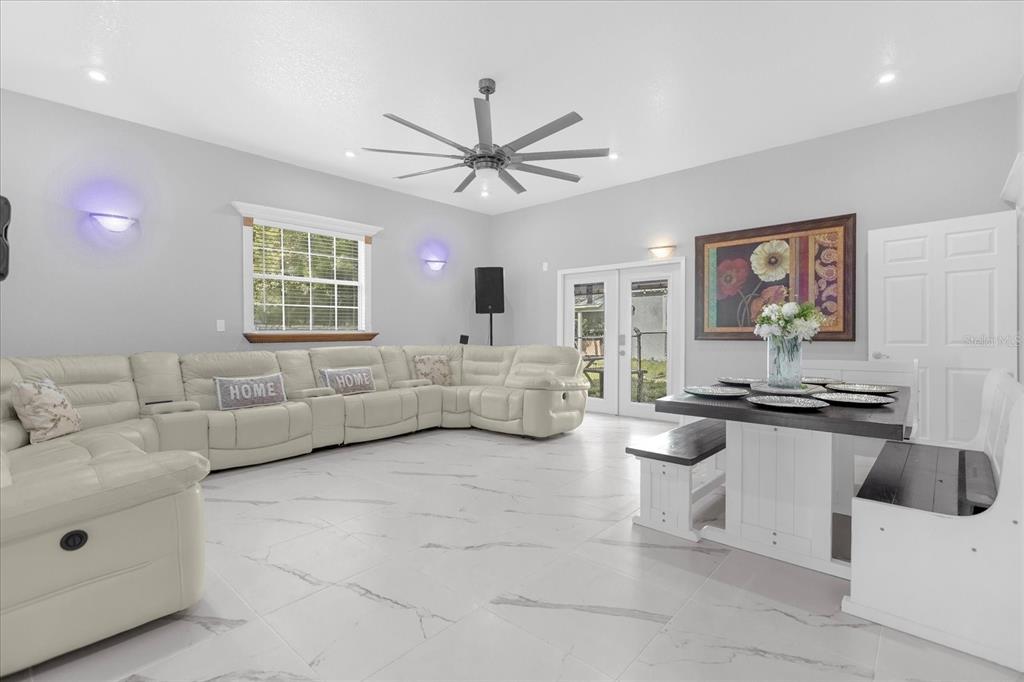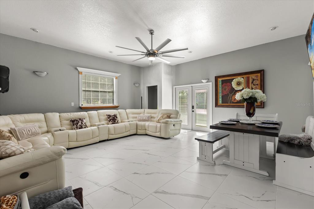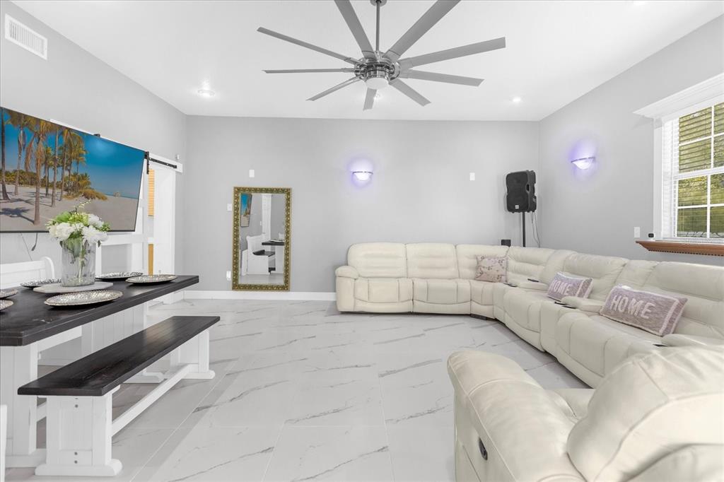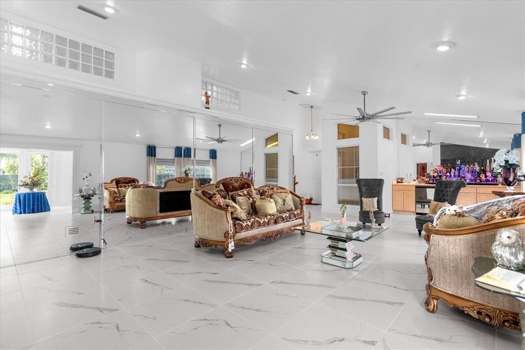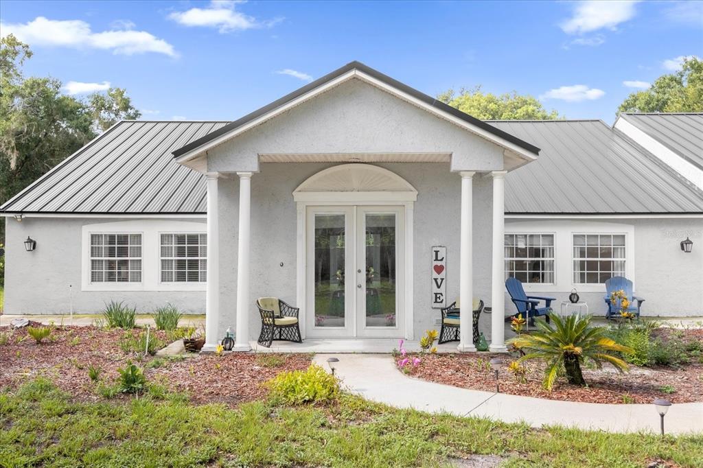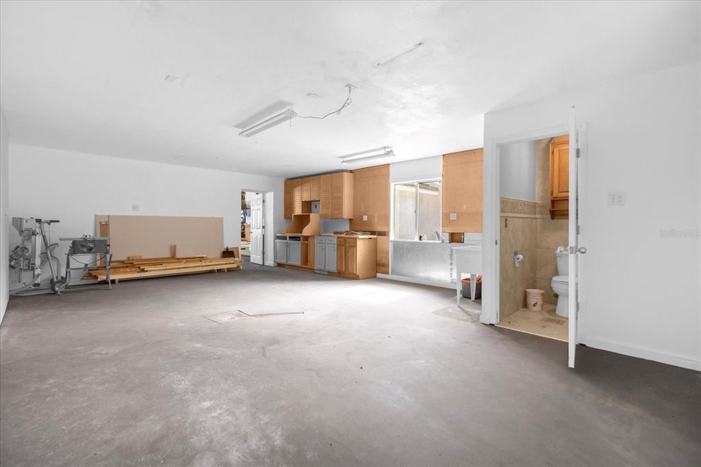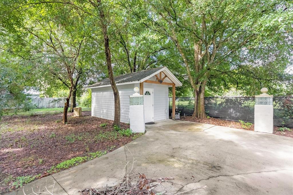 Price Just Reduced! One of a kind fully fenced one-acre estate is just minutes from Lake Nona and all Central Florida has to offer. Ideal for car enthusiasts and hobbyist this home features three garages with six bays, a breezeway workspace for additional vehicles, 50-amp upgraded electric service, compressor lines, and a full bath in one garage that can be utilized as an in-law suite or additional bedroom. Inside, enjoy 3 Bedrooms with family room, dinnin groom and family room, with features such high tin ceilings, crown molding,new tile floors, a built-in wet bar, movie/bonus room pre-wired for surround sound, formal dining, and a spacious kitchen with solid wood cabinets and premium appliances.The private master suite offers sliding doors to a seating area, large walk-in closet, and stylish ensuite bath. The lush grounds include pillar lights, a fire pit, a shed with water system, zoned irrigation on a separate well, and mature fruit trees. 2021 Roof , on septic tank and well.