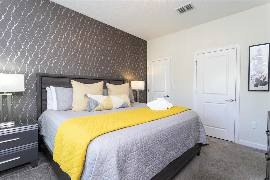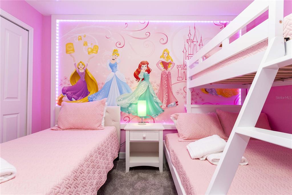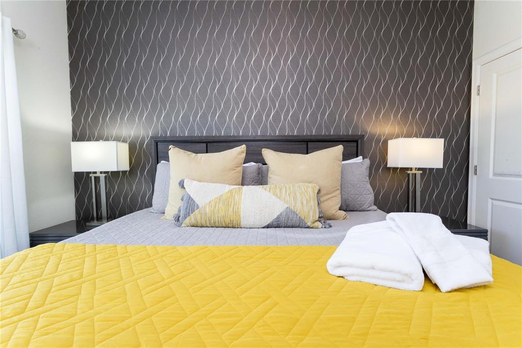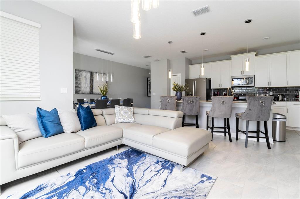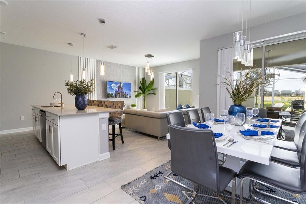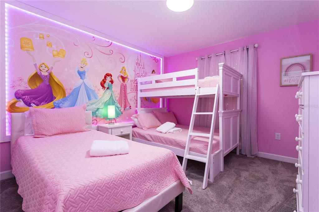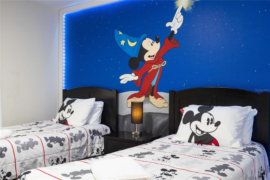 Beautifully furnished 4-bedroom townhome in the sought-after ChampionsGate resort community! No rear neighbours, This two-story layout features a convenient downstairs bedroom and full bath, along with a spacious upstairs master suite and two additional bedrooms. The open-concept design includes a modern kitchen that flows into the bright and airy living room, leading out to a private screened-in patio with a pool — ideal for relaxing or entertaining guests. Upstairs, two themed bedrooms create a fun and immersive experience for guests — one inspired by Mickey Mouse and another with a The Princess motif. The generously sized master suite includes a well-appointed bathroom with double sinks and plenty of natural light. As part of ChampionsGate, residents enjoy access to a world-class clubhouse with a restaurant, bar, fitness center, movie theater, and more. Outdoor amenities include a resort-style pool, splash pad, water slides, and a lazy river. Just under 7 miles from Disney, this home is perfect for short-term rentals, family vacations, or a second home in the heart of Orlando’s entertainment corridor.