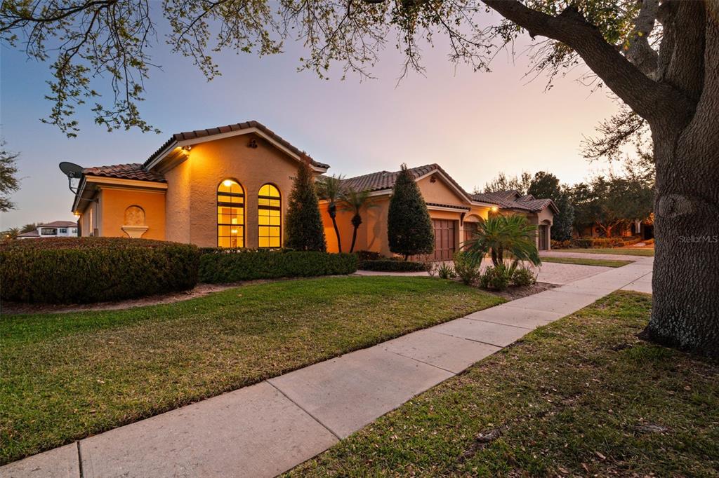 Welcome to this exceptional custom residence in the exclusive Venezia enclave, a quiet and desirable pocket community in the heart of Dr. Phillips. Built by Reiche and Silliman Homes, this elegant Mediterranean-inspired home blends refined architecture, thoughtful design and serene water views to create a remarkable living experience. A set of grand wood double entry doors opens to an impressive foyer and formal living and dining spaces, where soaring 12-foot ceilings, rich wood flooring, and expansive glass doors frame beautiful views of the pool and private pond beyond. In the evening, the fountain and water are softly illuminated, creating a captivating backdrop for entertaining and everyday living. The dining room is highlighted by a striking stacked stone accent wall and an elegant double tray ceiling that adds warmth and architectural dimension. The gourmet kitchen is designed for the passionate cook and avid entertainer. Outfitted with premium Viking stainless steel appliances, including a natural gas six-burner range with a vented hood, the space also features granite countertops, natural cherry cabinetry, a large center island and generous breakfast bar seating. The kitchen flows seamlessly into the spacious family room where custom modern built-ins and a larger stacked stone feature wall create an inviting setting for gathering with family and friends. A casual dining area and large glass sliders overlook the pool, patio and tranquil pond. The primary suite serves as a private retreat with serene views of the pool and water beyond. The suite features a spa-inspired bath with dual travertine vanities, a walk-in marble shower, jetted soaking tub, private water closet and two generous walk-in closets. A desirable split bedroom layout enhances privacy and comfort, with secondary bedrooms thoughtfully positioned and the fourth bedroom easily serving as a private office or study. Designed for effortless indoor and outdoor living, the screened lanai showcases a sparkling pool and a gas-heated spa, set against the peaceful pond and fountain views. Additional highlights include a well-appointed laundry room with cabinetry, abundant storage throughout, and approximately $15,000 in recent upgrades including a newer HVAC system and a new 55-gallon water heater for enhanced comfort and peace of mind. Ideally just minutes from acclaimed restaurants of Restaurant Row, premier shopping, major roadways and world-renowned attractions, this exceptional residence offers a blend of privacy, elegance and convenience in one of Central Florida’s sought-after locations.